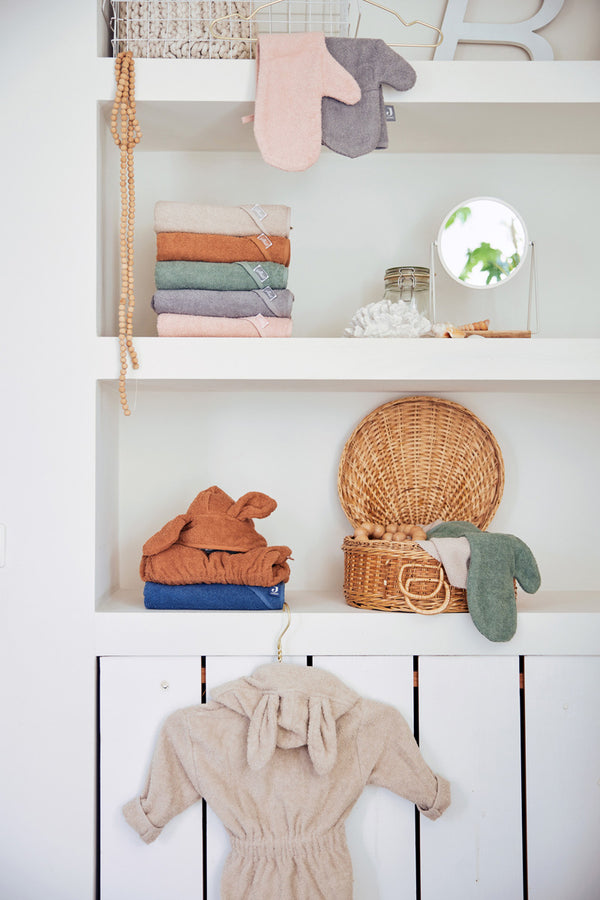 La serviette de bain éponge a une taille de 75x75 cm et est disponible en six couleurs tendance. Blanc, rose, caramel, nougat, gris et vert. La serviette de bain est fabriquée en 100 % coton.