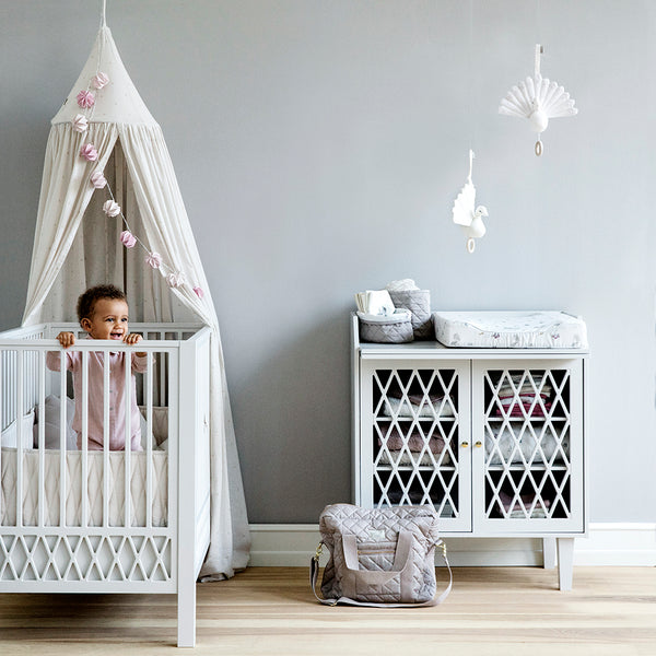 Couvre-lit de Cam Cam en coton 100% organique. Un ciel de lit de couleur crème s'accroche magnifiquement au-dessus du lit de bébé ou dans un coin de la pièce pour créer un endroit douillet. Fabriqué en tissu hydrophile doux, il est disponible en couleur pétrole ou en blanc crème.