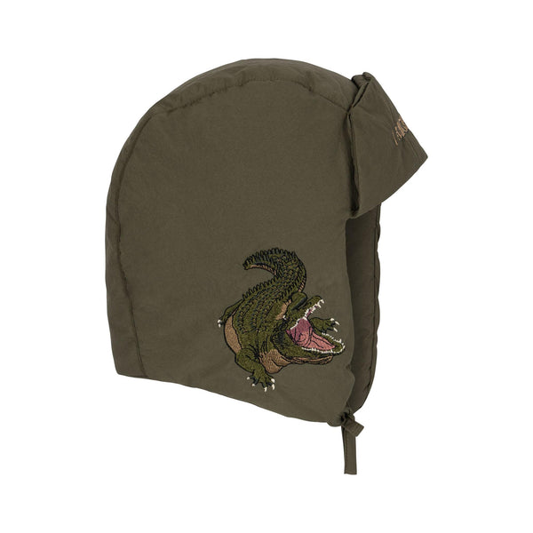 Ce chapeau doux et matelassé de Konges Slojd offre une protection optimale contre le froid et le vent. Il est confortablement doublé de polaire et peut être noué sous le menton pour un ajustement parfait.