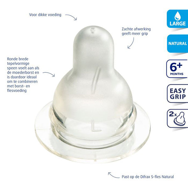 La tétine pour biberon Difrax Natural Large convient aux biberons S étroits de 170 ml, 240 ml et 250 ml. Le revêtement spécial de la tétine offre une prise en main extra douce....
