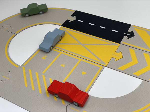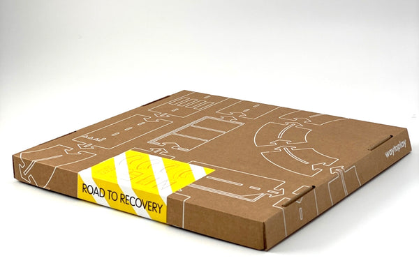 Les sets Road to Recovery sont plus rigides que les sets classiques de Waytoplay, mais le carton s'adapte parfaitement aux rails de voiture flexibles. Le jeu comprend huit pièces en carton avec une impression spéciale. Les longues courbes et le grand parking distinguent ce jeu des circuits automobiles flexibles.