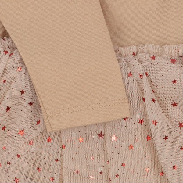 Robe de ballerine souple à manches longues avec manches bouffantes et jupe en tulle à trois épaisseurs. Se ferme par un bouton perlé au dos.