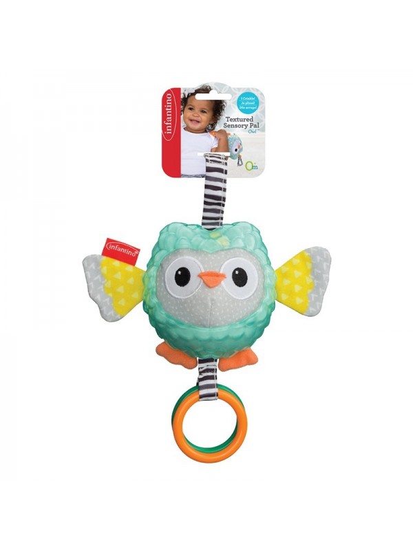 Eine Eule mit vielen Überraschungen. Der Körper besteht aus sehr weichem Stoff und die Flügel machen das Geräusch von zerknittertem Papier. Einfach durch Kleinkinder und mehrere Texturen für die Entwicklung Ihres Kindes zu greifen. Ausgestattet mit einem Ring, damit er überall aufgehängt werden kann.