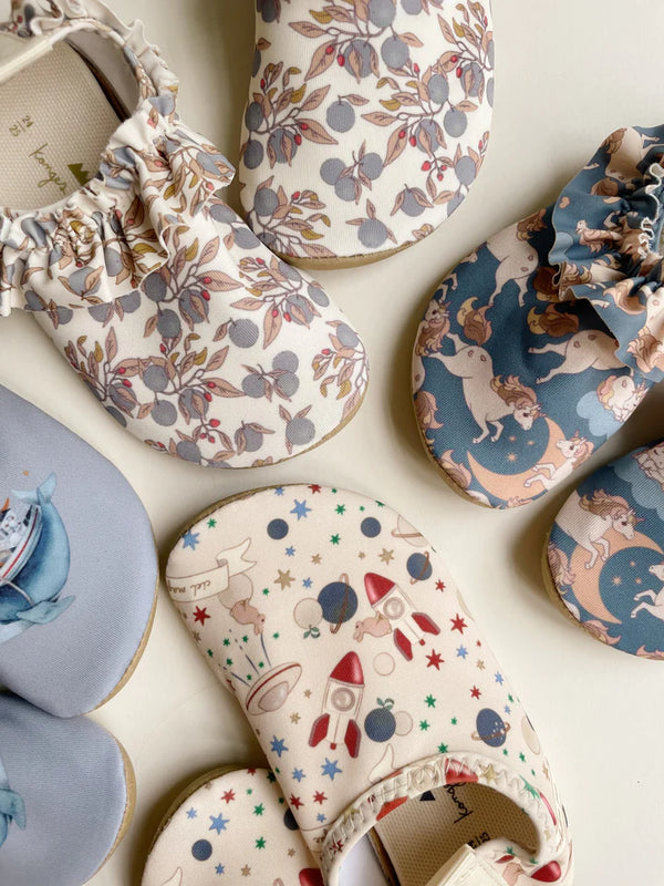 Super süße Schwimmschuhe von Konges Slojd Mit Unicorn -Druck. Wasserschuhe bestehen aus 95% Polyester und 5% Elastan mit niedlichen Rüschen. Die Schuhe haben flexible Gummisälen mit Anti -Slip und sind leicht anzuziehen. Die Wasserschuhe sind ideal für einen Kieselstrand und bieten einen glatten Schwimmbad. Das elastische Material schützt dank des höchstmöglichen UV -Schutzfaktors von UPF 50+ vor UV -Strahlung