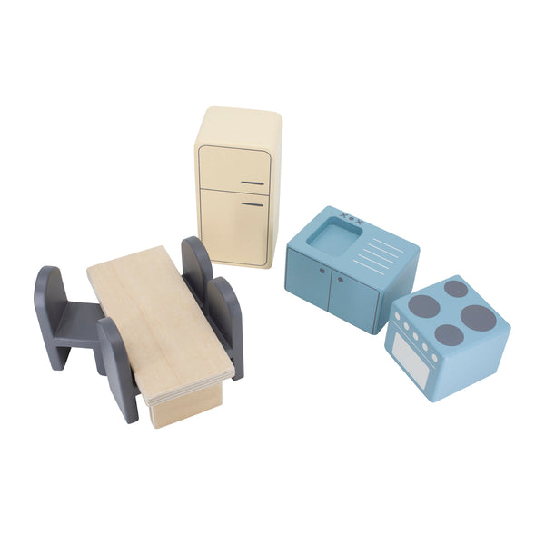 Dieses dänisch gestaltete Küchenset enthält verschiedene Küchenartikel: einen Esstisch mit vier Stühlen, einem Kühlschrank, einem Waschbecken und einem Herd mit Kochfeld und Ofen.