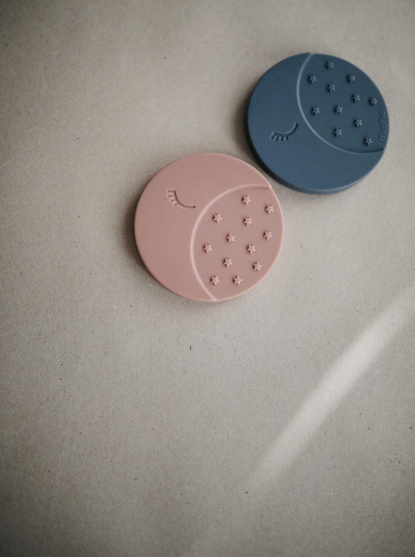 Mushie has designed a silicone teething ring in the shape of a moon. The Mushie teething ring can be used from the time the first teeth come through, around 6 months.