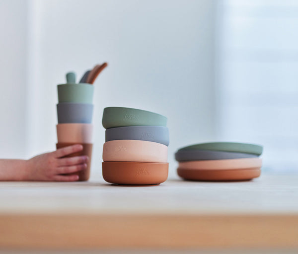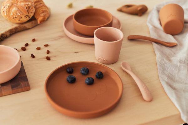 Cute children's tableware set from Jollein. The children's tableware set is made of 100% silicone and consists of a plate, a bowl, a cup and a spoon. Under the plate and bowl is a convenient suction cup and all parts are freezer, microwave and oven resistant. The silicone dinner sets are also dishwasher safe. The children's dinner set is available in pink, green, gray and caramel.