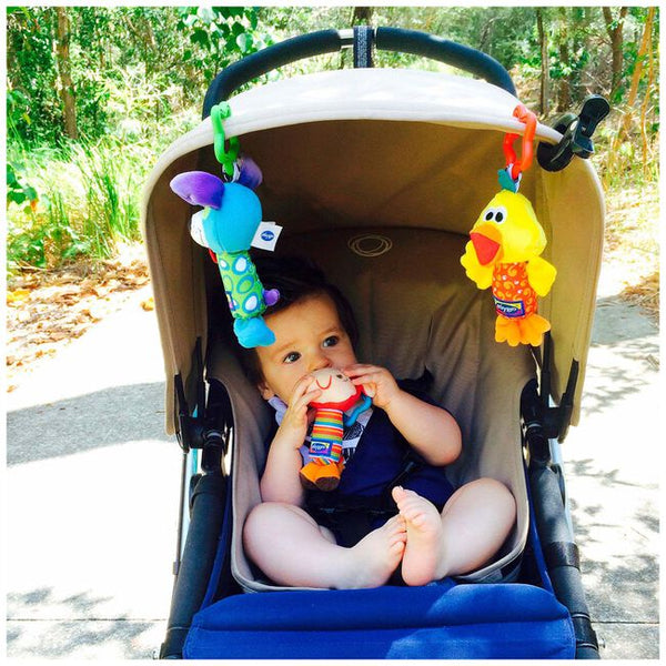 Meet this jingling trio of baby carriage toys. The bird, cow and dog are ideal for teething; they help soothe sore gums. The bright colors and bell/rattle sounds are sure to keep your little one occupied on the go! These three friends easily attach to strollers, baby carriages, car or bouncers.