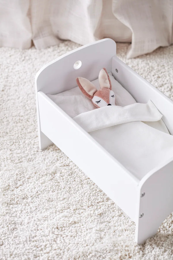 Give your child a charming and stylish doll bed from the STAR series, complete with 100% cotton bedding and pillow. Made of sturdy white-painted MDF, this beautiful doll bed is an ideal sleeping place for dolls and stuffed animals. The matching bedding is designed for comfort and has a pillow filling of soft polyester.