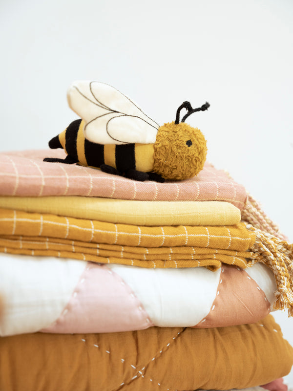 Meet Fabelab's new buzzing Bee character Bolette. Bolette buzzes and rattles around among the beautiful flowers and friendly creatures in the colorful orchard. With her large, scratching wings, sound spindle and composition of different fabrics, she is designed to entertain and stimulate your little one through their eager hands, ears and mind!