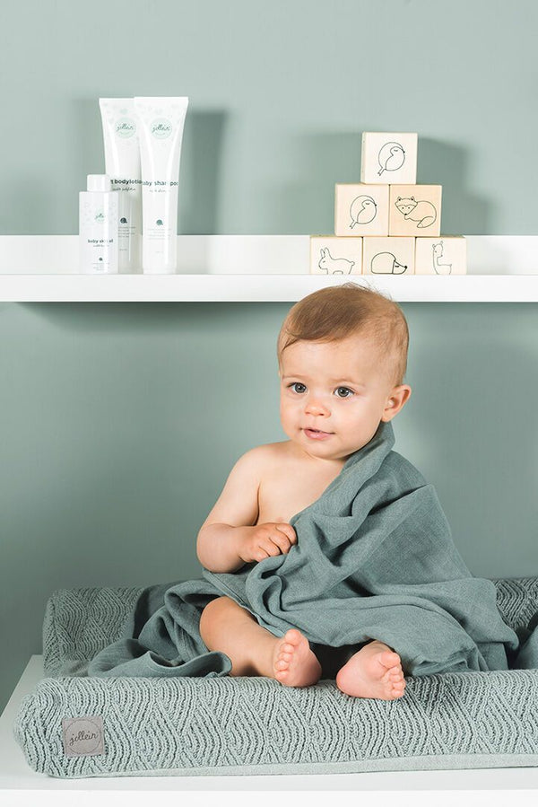 The Jollein Bamboo hydrophilic towels Ash Green are delivered as a 4-pack in the colors gray/dark gray, green/dark green, pink/dark pink and mustard/rust. The cloths are made of 30% cotton and 70% bamboo. The size is 70x70 cm.