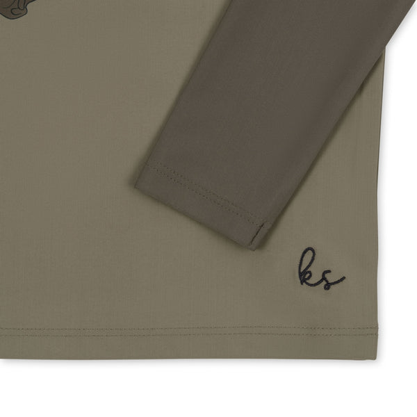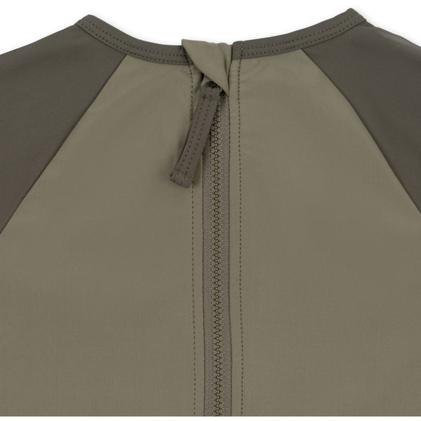 Swim shirt made of 80 percent recycled polyester and 20 percent elastane. The shirt features a zipper closure with wrap around back for easy dressing and dinosaur spikes on the side. The stretchy fabric protects against UV rays from the sun with the highest UV protection factor , UPF 50+. Children's skin is incredibly sensitive to sun rays. While your little one is playing in the water or at the beach, this swim shirt provides extra protection from the sun & fresh wind.