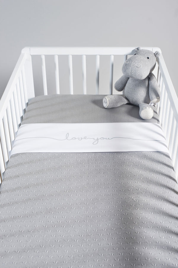 Beautiful sheet of 100% cotton with fun print. On the white sheet is a print with the text 'love you' in stone green. The dimensions are 120x150, so it is suitable for your crib.