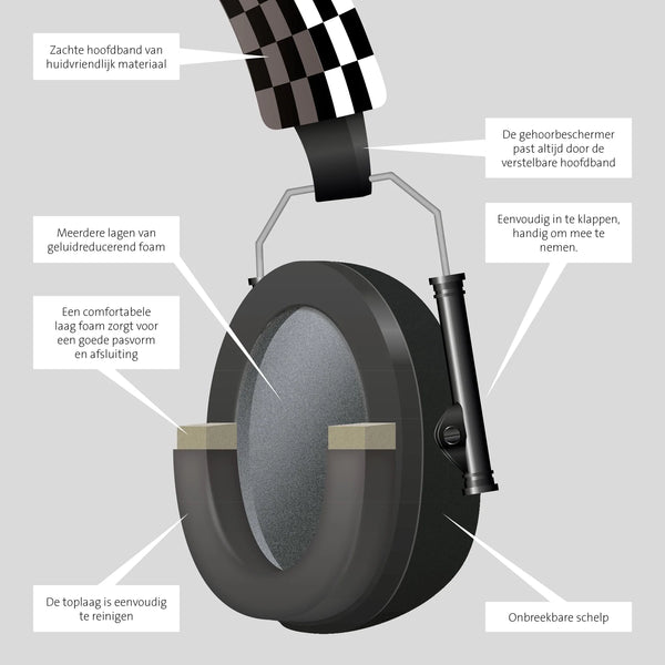 Het geluid wordt gereduceerd tot een minimum, de zachte hoofdband zorgt voor een comfortabele pasvorm en de 2-puntsbevestiging zorgt voor een gebalanceerde drukverdeling. Hij is geschikt voor kinderen vanaf 18 maanden.