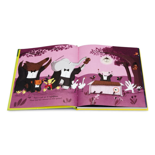 " Wat is Paco blij! Vanavond is er een mooi concert in het bos. Maar waar zijn de muzikanten? Help jij met zoeken? Luister onderweg naar de klarinet, de piano, de viool, de contrabas, de xylofoon, de piccolo, de celesta, de cello, de dwarsfluit, de fagot en …"