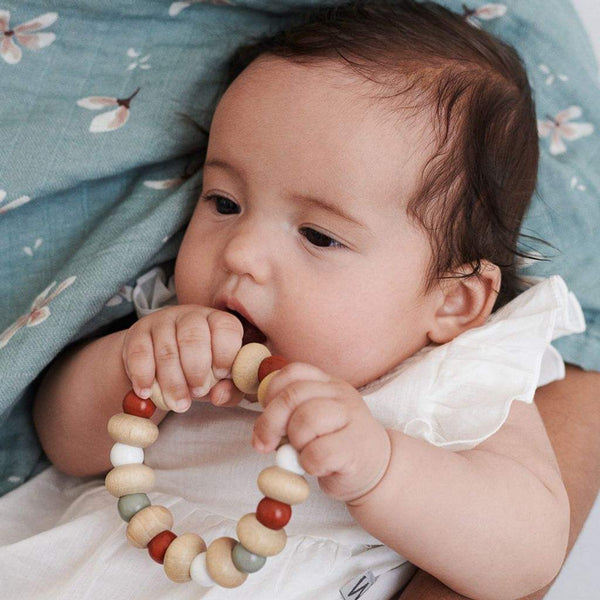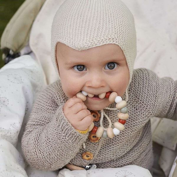 De bijtring is flexibel en heeft een grappig klikgeluid om de nieuwsgierigheid van de baby te wekken. De rammelaar is gemaakt van esdoornhout en afgewerkt met kindvriendelijke aquarelverf. Leeftijd: vanaf 3 maanden.