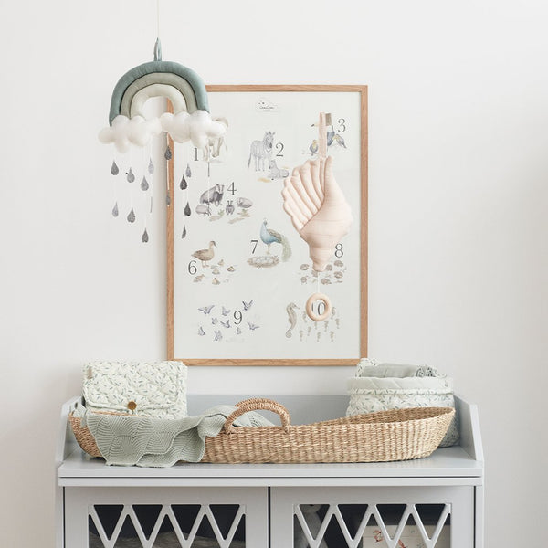 Schattige muziekmobiel in de vorm van een schelp die verfijning en poëzie toevoegt aan elke kinderkamer. Perfect bij het wiegje, in de wandelwagen of bij de commode