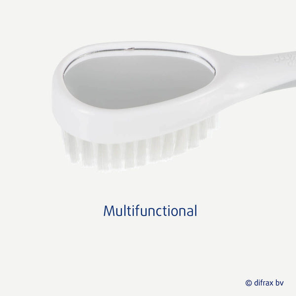De baby borstel en kam set wit is speciaal ontworpen om irritaties op de hoofdhuid van baby's en jonge kinderen te voorkomen. Dankzij de zachte borstelhaartjes is de set te gebruiken vanaf de geboorte. Zodra je kleintje zelf zijn of haar haartjes kan kammen, heeft de borstel een spiegeltje aan de achterkant zodat naar zichzelf kunnen kijken.