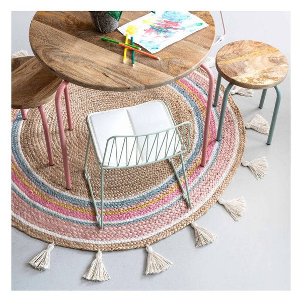 Het kleed is gemaakt van jute. Leuk op de speelkamer of op de kinderkamer, je kunt het door de diversiteit aan kleuren met heel veel combineren.