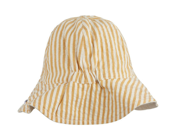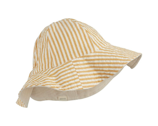 Dit zandkleurige zonnehoedje van Liewood is aan beide zijden draagbaar. Je kunt kiezen tussen een zandkleurige kant of een kant met witte en okergele strepen. Het hoedje heeft een elastische achterzijde.